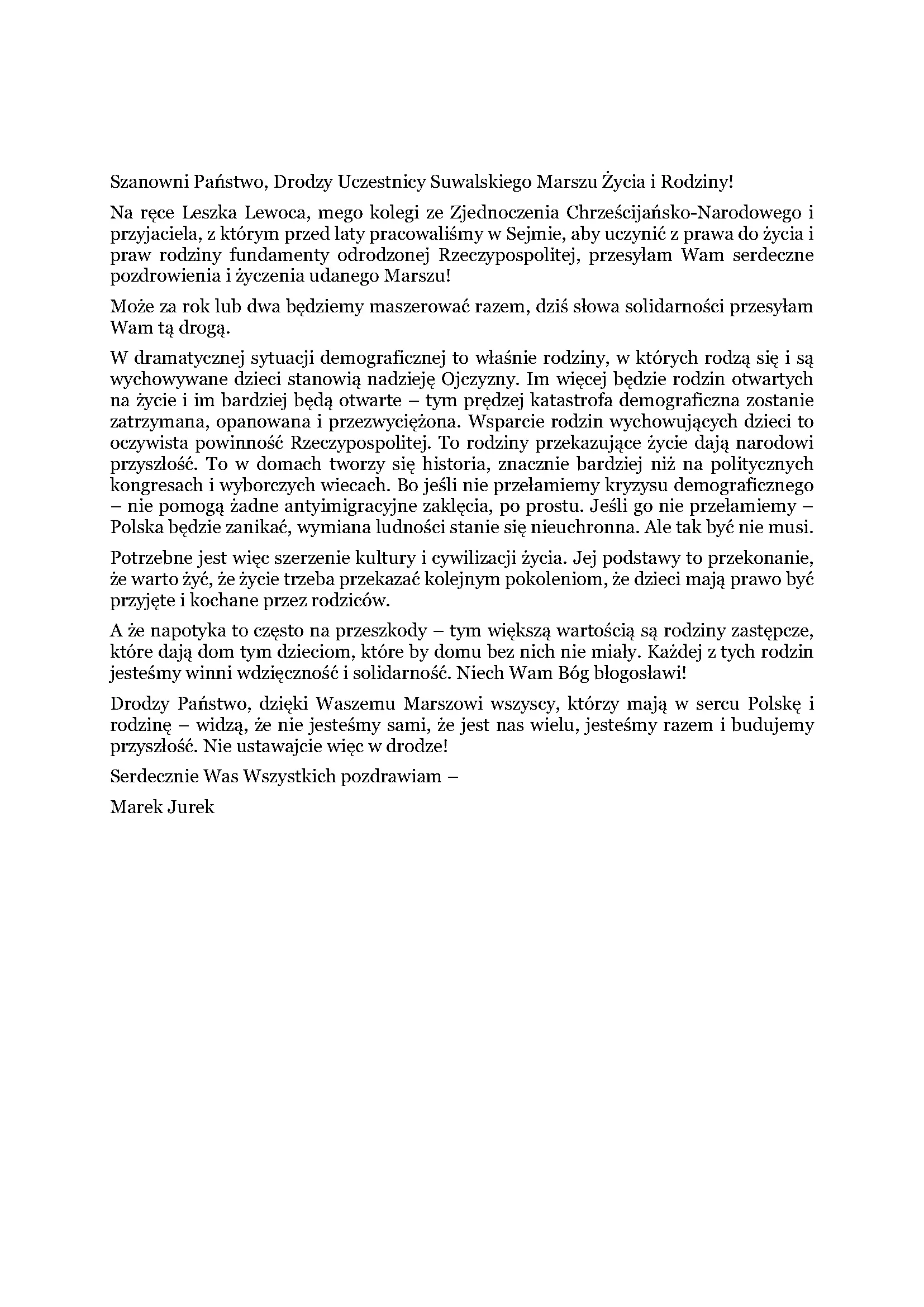 Cieszmy się tym, co dzięki łasce Bożej jest nam dane. Składamy wielkie Bóg zapłać wszystkim, którzy przez te lata współtworzą nasz Marsz i ubogacają swoją obecnością oraz darami serca. Serdecznie zapraszamy do Suwałk na tegoroczne nasze świętowanie wszystkich, dla których drogie są wartości życia i rodziny.
