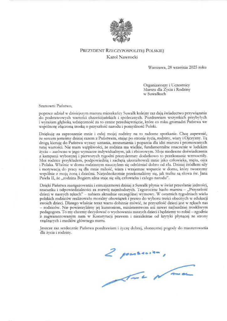 Udział w Marszu był pięknym doświadczeniem – wzruszającym, pełnym ciepła i solidarności. Było widać, jak ważne są dla nas wartości rodzinne i troska o Ojczyznę. Atmosfera życzliwości i pozytywnej energii na długo pozostanie w moim sercu. Dziękuję wszystkim, którzy tworzyli ten wyjątkowy dzień.
